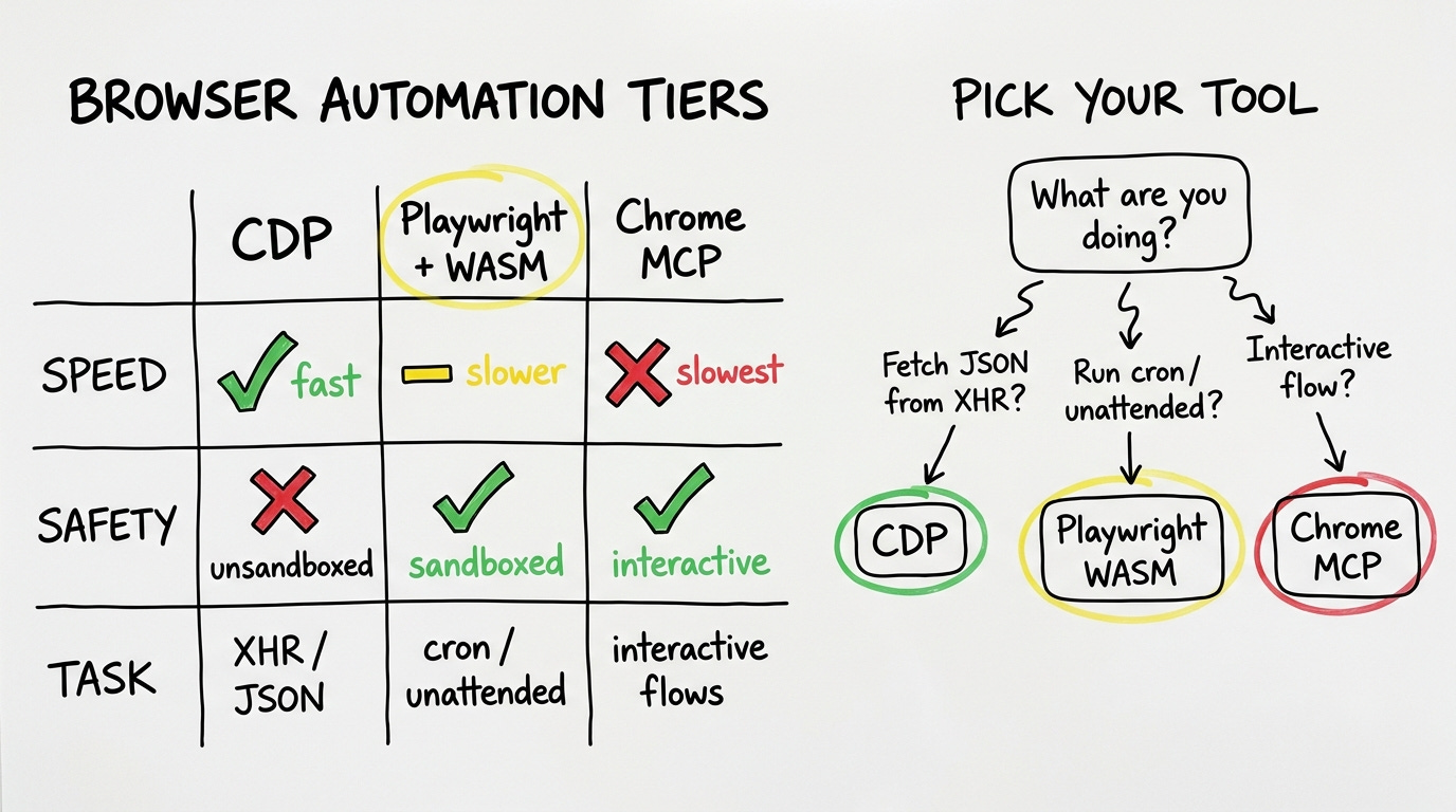 Safety: The WASM sandbox wins for unattended scripts. The blast radius of a bad CDP script is your entire machine. The blast radius of a bad sandbox script is nothing outside the browser. Chrome MCP sits somewhere in between.