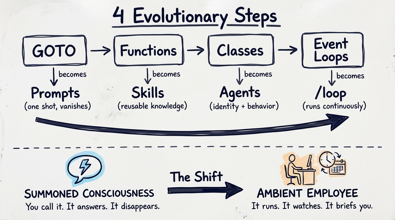 Not in a bad way. Assembly is powerful. You can build anything with it. But every instruction is manual. Every execution is atomic. You write a prompt, you get a response, the session ends. You summon something, it answers, it disappears. The intelligence exists in flashes. Discrete. Ephemeral.