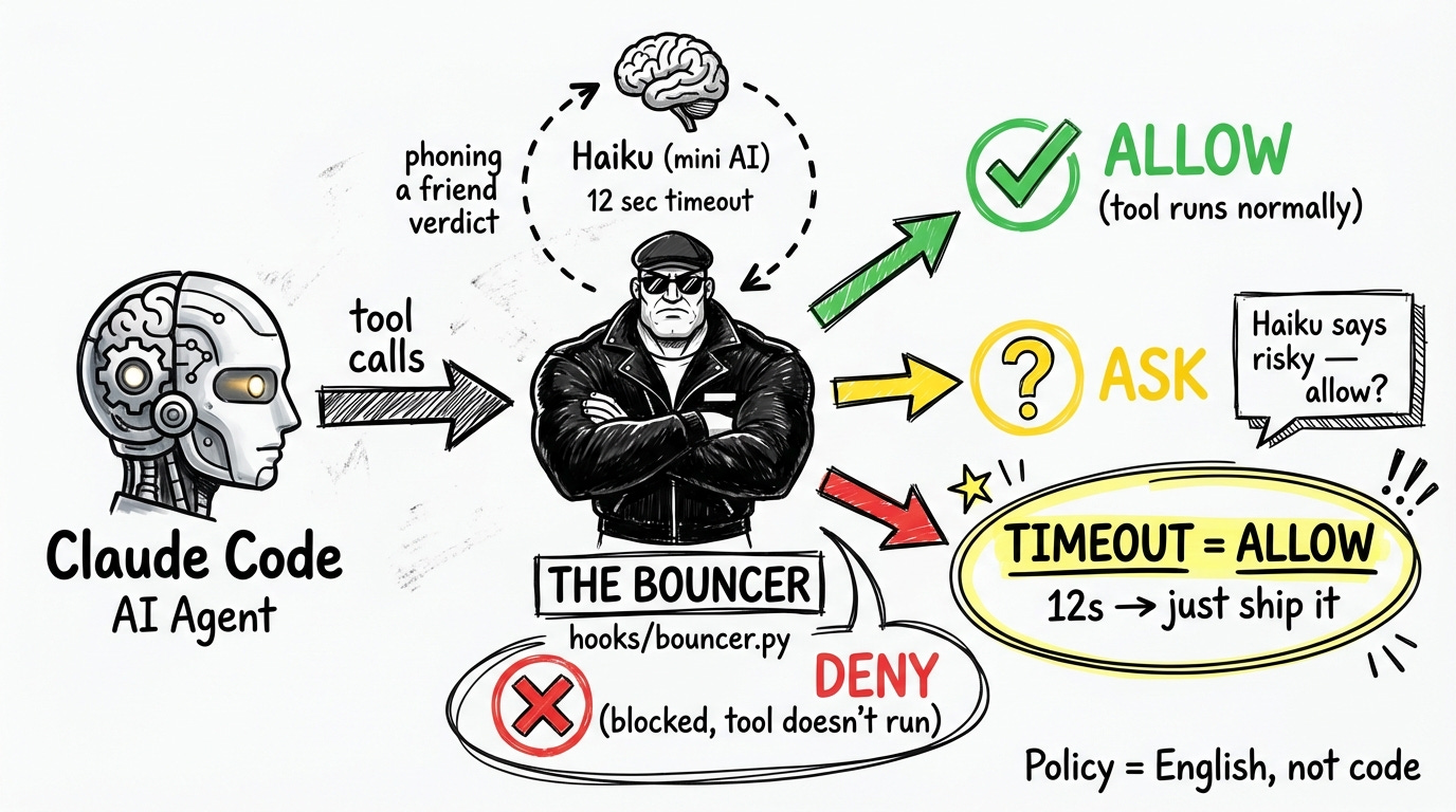 My reasoning: the thing I’m protecting against isn’t “Claude does something dangerous.” It’s “I get interrupted for no reason.” Before the Bouncer, I was already clicking Yes without reading. My security was fail-random. Explicit and imperfect beats implicit and random.