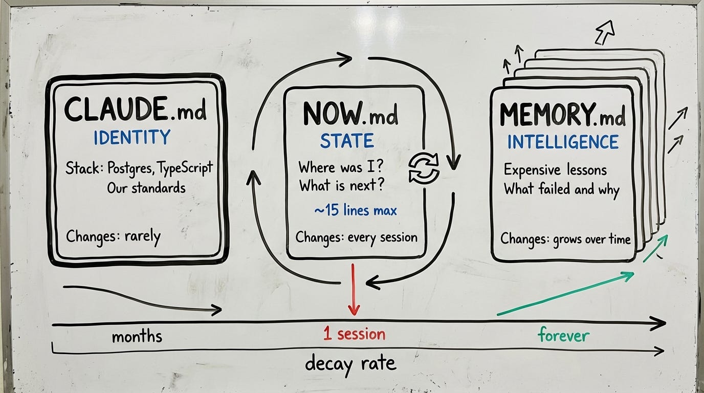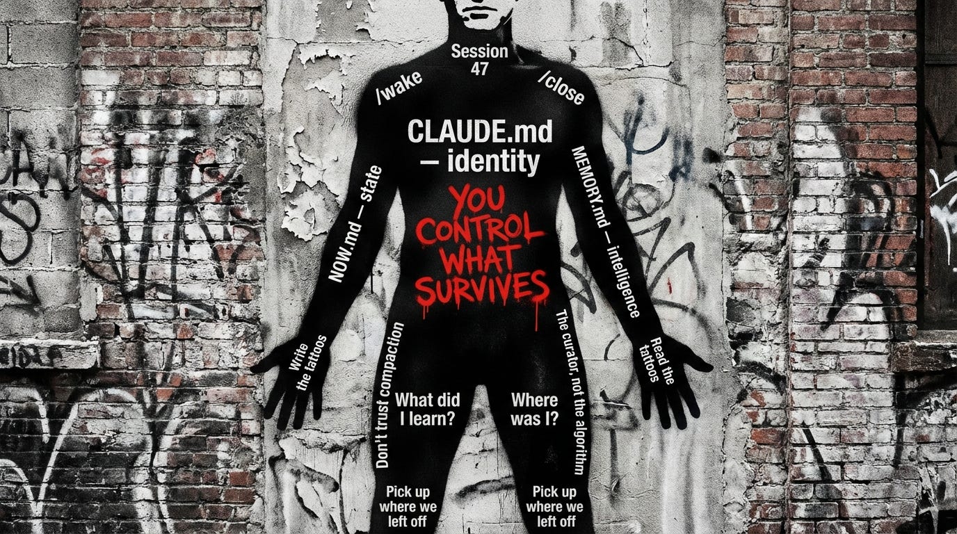 The after: “Session 47. /wake loads CLAUDE.md. Postgres, not MySQL, decided in session 12. NOW.md says I’m mid-refactor on the auth module. MEMORY.md has a note from session 23 that approach X doesn’t work because of Y. Picked up in 30 seconds.”