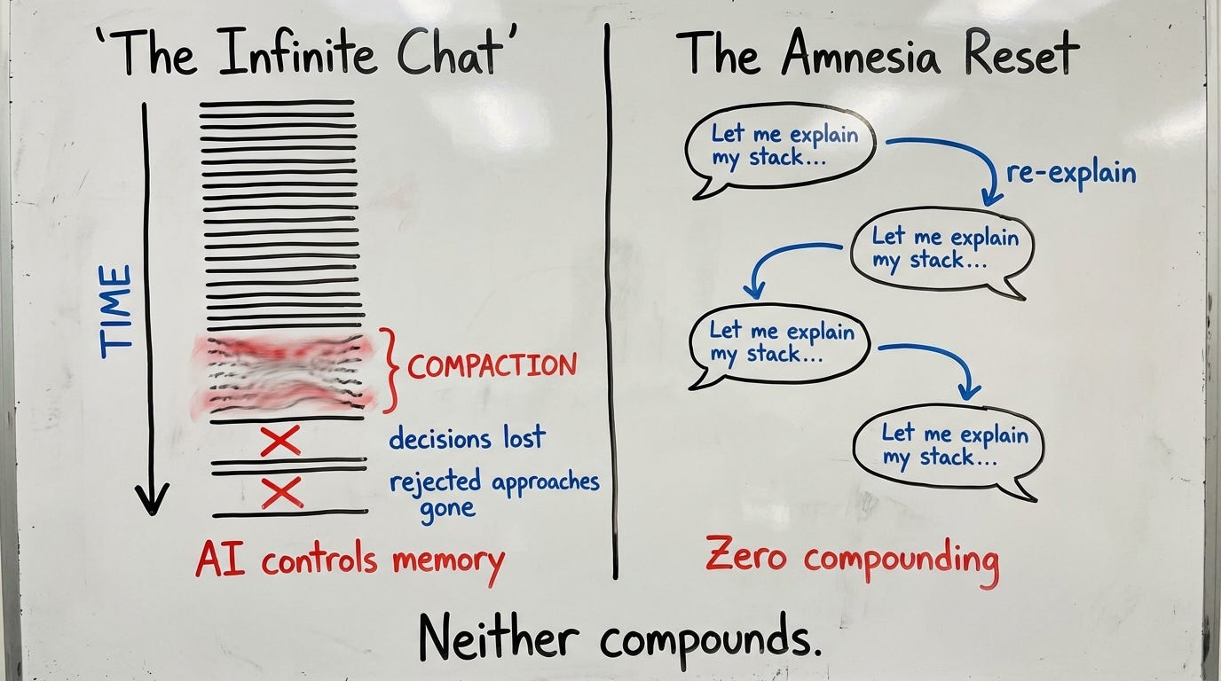 The Amnesia Reset avoids that by starting fresh. But you pay for it every session, re-explaining things that should be permanent.